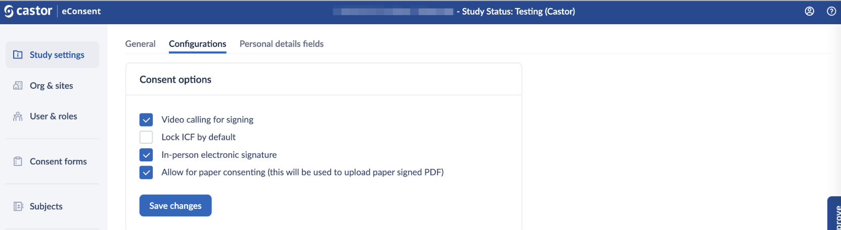 1. In the 'Study settings' tab, navigate to the 'Configurations' sub-tab and make sure the option 'Allow for paper consenting (this will be used to upload paper signed PDF)' is enabled