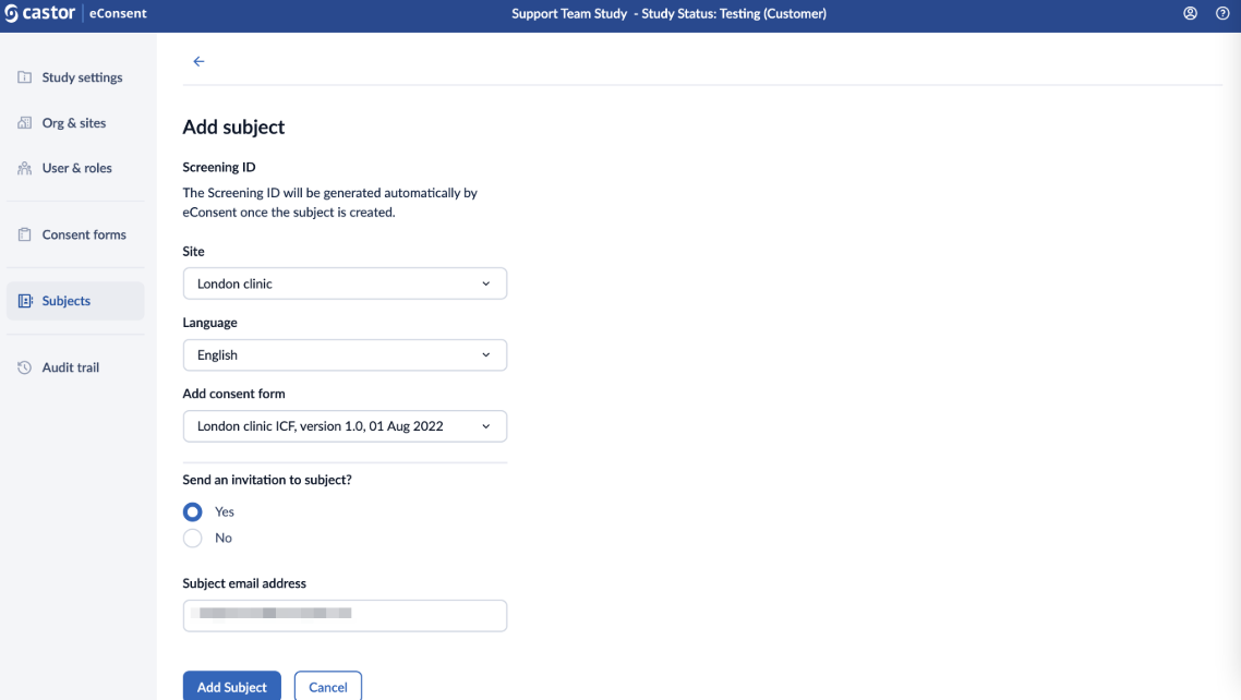 When using an electronic form, you can choose to send an email invitation to the subject if needed.