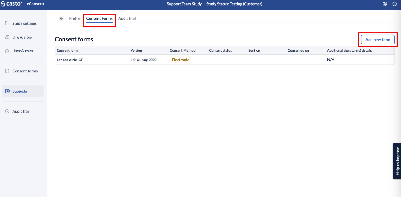 6. Alternatively, after opening a subject, navigate to the 'Consent Forms' sub-tab and click on the 'Add new form' to add another consent form:
