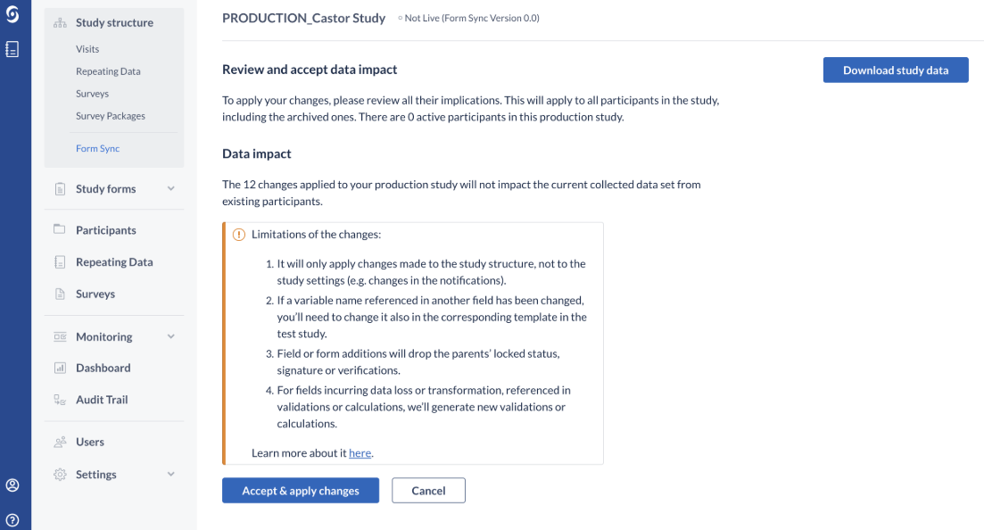 - To confirm and finalize your structure updates, you will need to review and accept all of the data changes. The changes will apply to all existing participants in the study, including locked and archived participant records