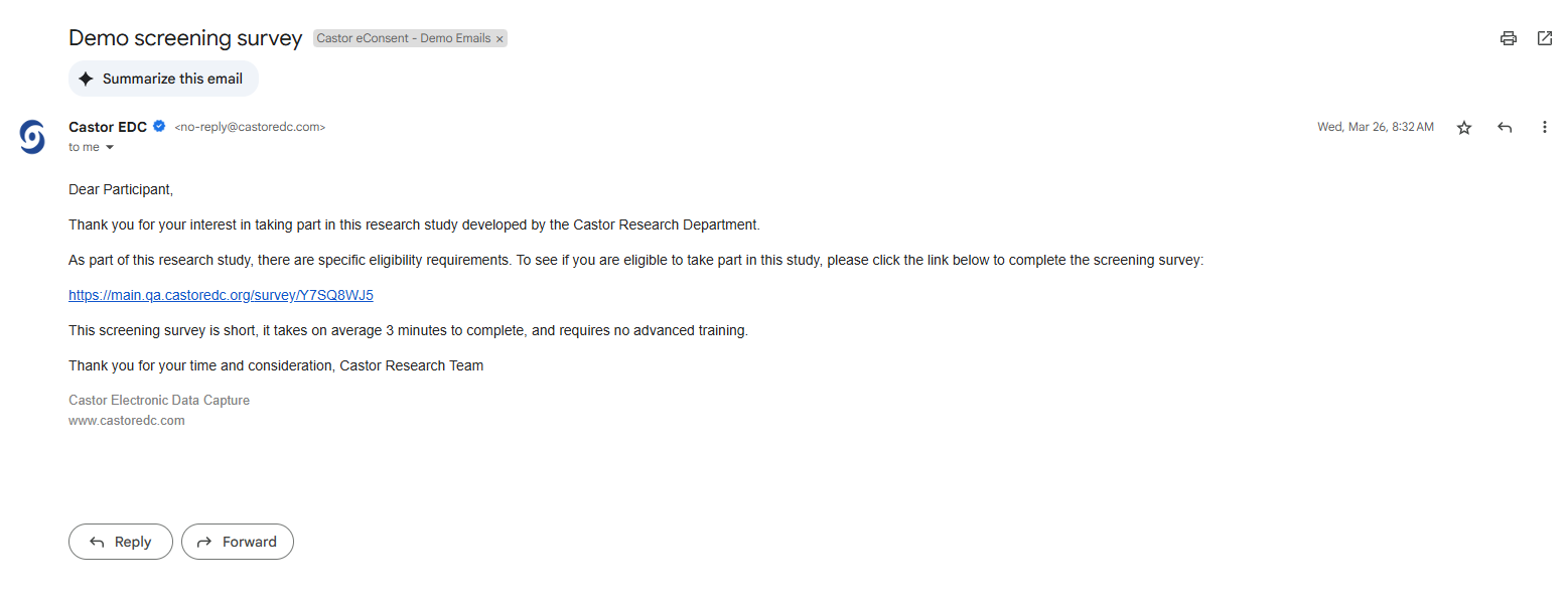 - Eligible Participants who complete the prescreening survey are sent a Castor eConsent email invitation