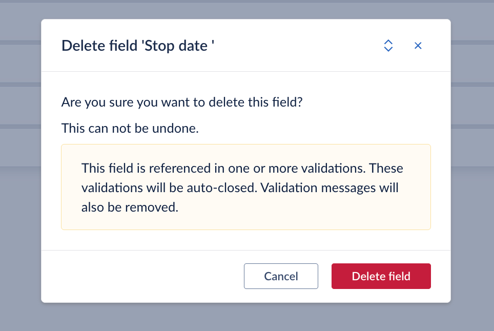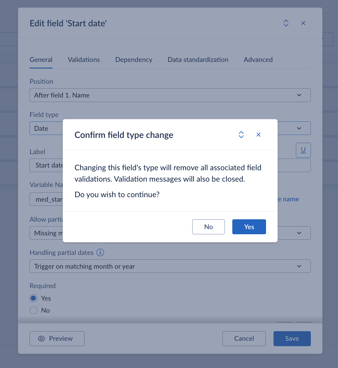 When a field’s type is changed and the field is used in a validation configuration - either as a source or a reference - the system will automatically remove all related validations and auto-closes associated validation messages to maintain study integrity. Study designers are shown a static warning in the field’s dialog before proceeding, ensuring they understand the impact of their change.