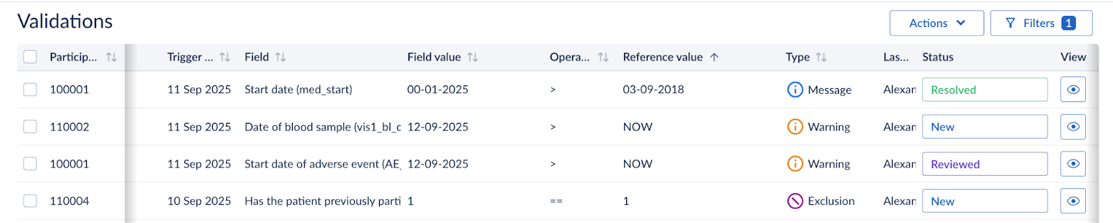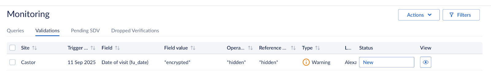 To strengthen data privacy, when a validation is triggered on an encrypted field, the 'Reference value' and 'Operator' are now shown as *hidden* in the Validations Overview grids and returned as *hidden* by the public API. The source's 'Field value' continues to remain encrypted as before. This applies to all studies and prevents sensitive values or logic from being inferred while preserving visibility of validation events for monitoring and audit.