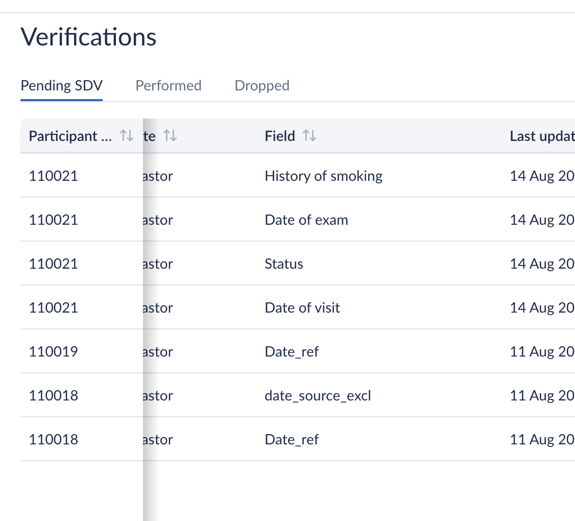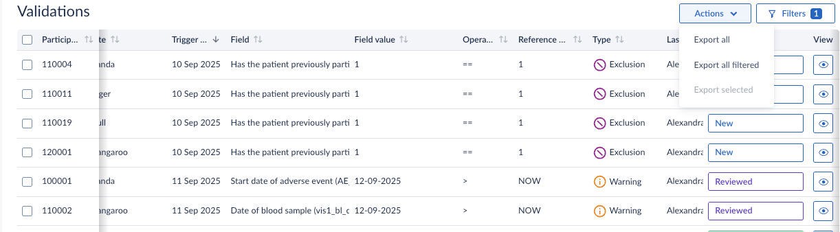 The 'Reference value' column in both global and participant-level Validations grids now displays the actual value from the referenced field (dynamic) or of the referenced value (static) when a validation is triggered. This allows data managers to more easily review the context of each validation.
