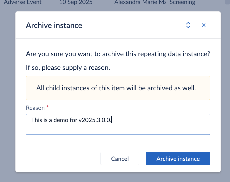 This fix ensures that when a participant is archived in studies where reusing participant IDs, the relevant audit trail entries are also updated.We have also fixed an issue where archiving participants failed when the “Allow reuse of participant IDs” setting was enabled in a study. Previously, attempting to archive such participants resulted in an error, with no audit trail entries recorded and no instances archived. With this fix, participants (and all their related instances) are now archived as expected.