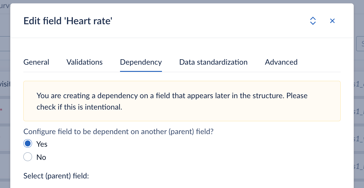 To ensure consistency and prevent unsupported configurations in mobile-enabled (using the Castor Connect app) studies, Castor CDMS now fully blocks the creation of field-to-field validations on survey fields that are part of a Castor Connect (mobile) survey package. Previously, users received only a warning; now, the system enforces this restriction at both the UI and API levels.