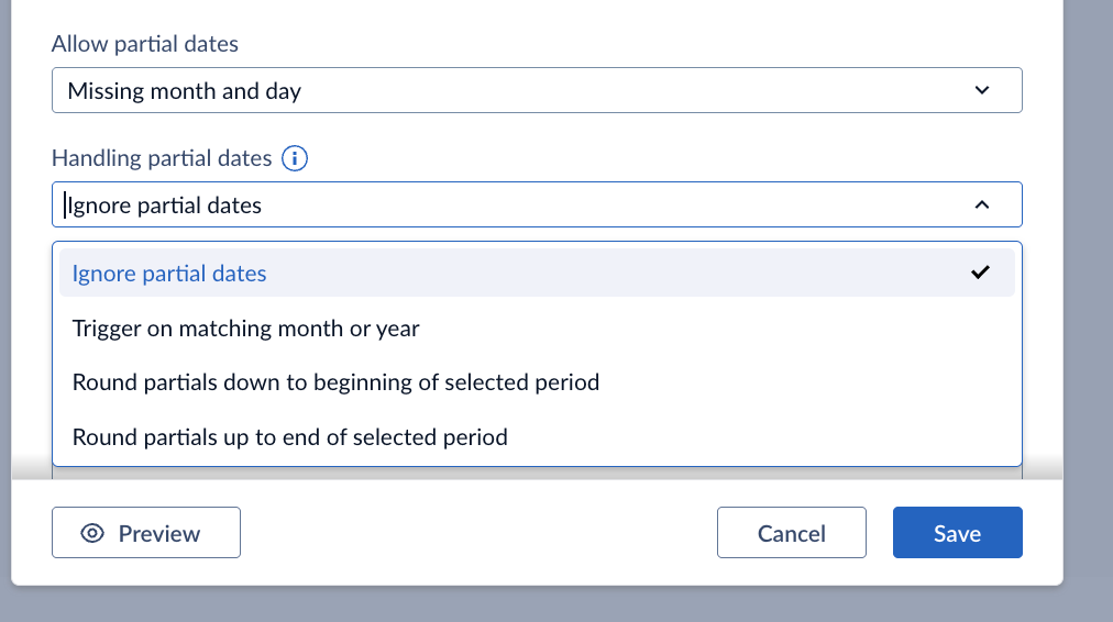 When setting up the validation (on a source field), you can choose a handle method (via the input 'Handling partial dates'). The handle method selected dictates how the validation should be evaluated (whether to ignore partial dates, compare by matching month or matching year, or round them to the beginning or to the end of the period). This flexibility better reflects real-world clinical data entry scenarios, reduces false validation triggers and ensures higher data quality.