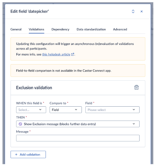 To ensure smooth study execution on Castor Connect (mobile app for ePRO), Castor CDMS now helps study designers avoid unsupported validation configurations. When configuring field-to-field validations (such as date-to-date comparisons) within surveys marked for Castor Connect, a warning banner is displayed to inform users that these validations are not supported in the mobile app.
