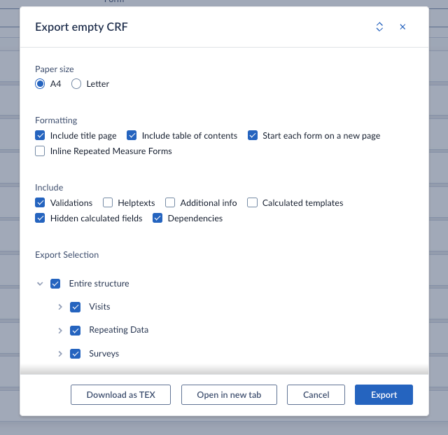 The Empty CRF export (PDF) is also fully compatible with date-to-date field validations. When validations compare one date field against another, they are displayed in a clear, consistent format such as “Warning: field is smaller than <ReferenceFieldName>” or “Information: field is equal to <ReferenceFieldName>”. Handling of encrypted fields in the PDF remains unchanged.